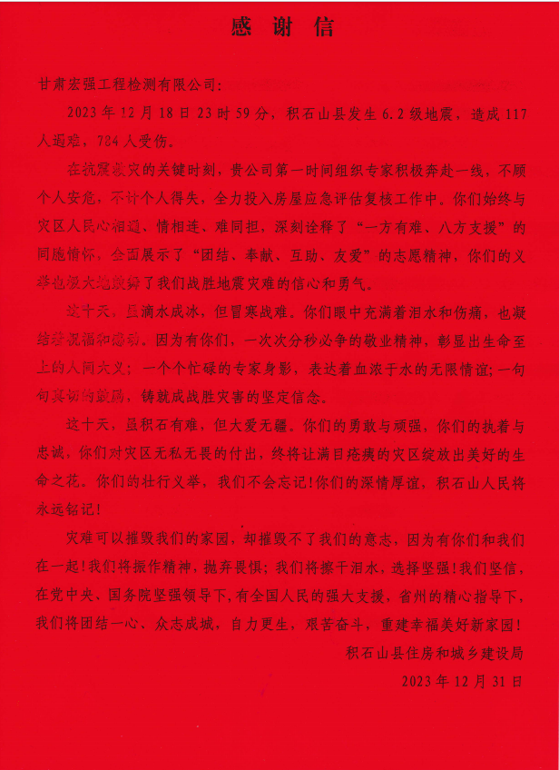 1月4日,積石山縣住房和城鄉(xiāng)建設(shè)局為甘肅宏強(qiáng)工程檢測(cè)有限公司送來了寫有“抗震救災(zāi)保民平安,為民奉獻(xiàn)恩重如山”的錦旗和《感謝信》,以感謝甘肅宏強(qiáng)在積石山縣發(fā)生6.2級(jí)地震后的強(qiáng)力馳援和無私奉獻(xiàn)。